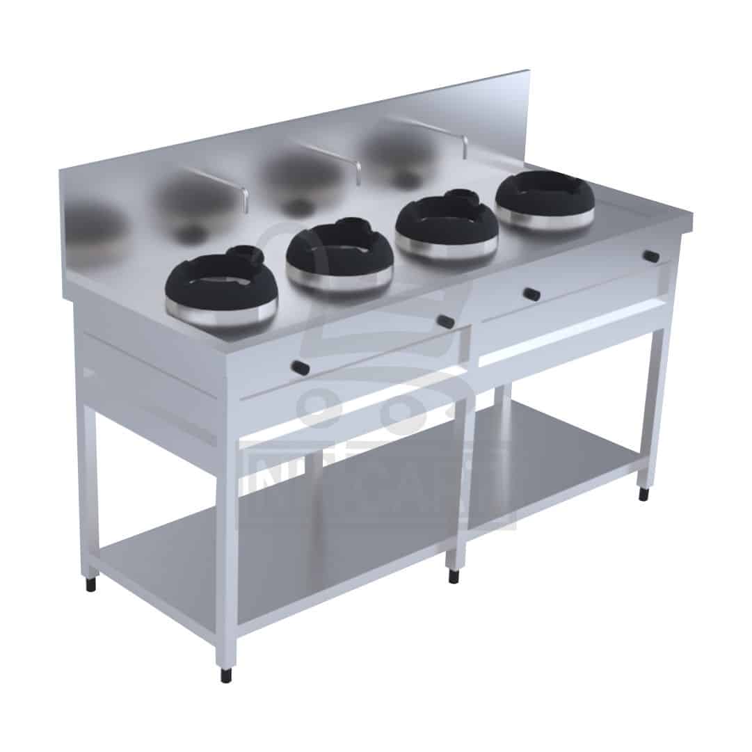 • 4 Inline Chinese Burners: High-pressure burners with wok rings, designed to deliver focused, intense heat for wok-based cooking.